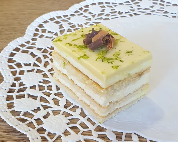 Limetkový rez 10 ks Korpus plnený osviežujúcim limetkovým krémom a potiahnutý do bielej čoko