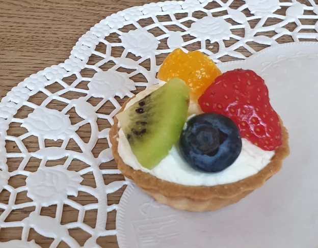 Tartalette plnená marmeládou, mascarpone šľahačkou a ozdobená kúskami ovocia.