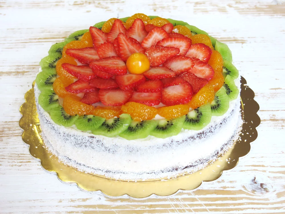 Kakaový korpus bez lepku je naplnený krémom bez laktózy. Chuť torty je doplnená šťavnatým ovocím- jahodami, banánmi a broskyňami. Torta je potiahnutá do krému a obalená v kokose. Na vrchu zdobená sezónnym ovocím.