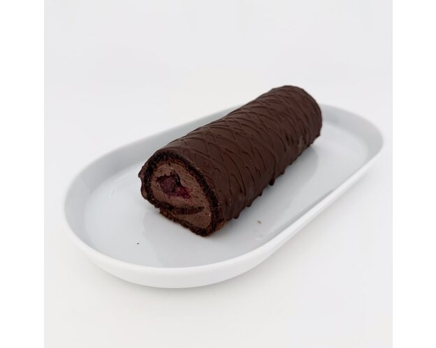 Bezlepková kakaová roláda plnená čokoládovým krémom a višňami, potiahnutá čokoládovou polevou