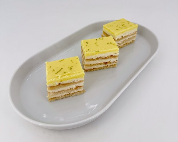 Dobošové roládové pláty naplnené limetkovo-citrónovým krémom. Poliate polevou z limetky a bielej čokolády.