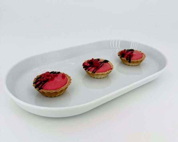 Košíček z lineckého cesta plnený malinovou plnkou s malinovým ganache, dozdobené sušenými malinami a čokoládou.