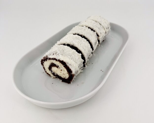 Marcipánovo-čokoládové cesto, plnené kokosovým krémom a obalené v kokose