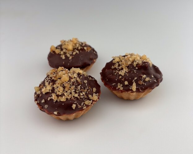 Košíček z lineckého cesta s orechovou plnkou potiahnutý v čokoládovej poleve a dozdobený orechom.